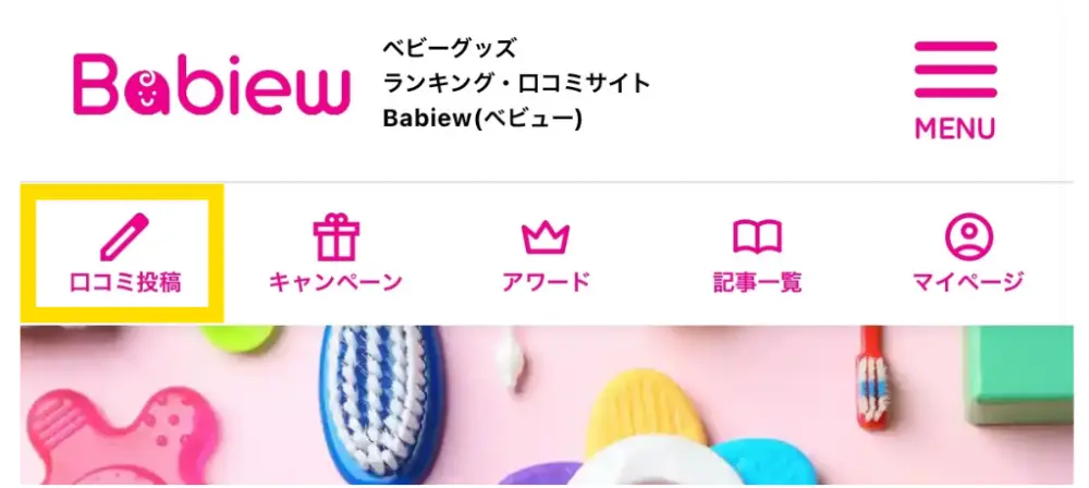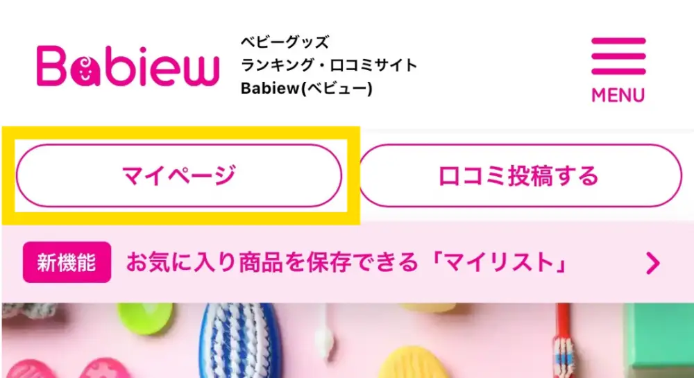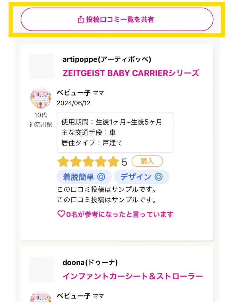 自分が過去に口コミ投稿した商品を確認したい時や、お友達に使った商品の口コミを一覧にして共有したい時、べビューのマイページから「投稿口コミ一覧」の共有機能が便利です。