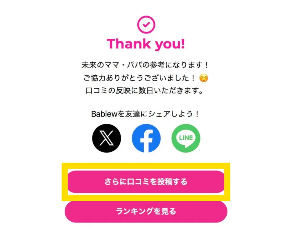 投稿完了後に、「さらに口コミを投稿する」ボタンを押せば、続けて口コミを投稿することができます。
