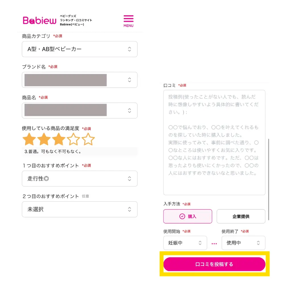 商品カテゴリ・ブランド・商品・星評価・おすすめポイント・入手方法・使用期間は全て選択式です。自分が思う本音の感想を「口コミ」部分に記載したら、最後に「口コミを投稿する」ボタンを押して投稿完了!
