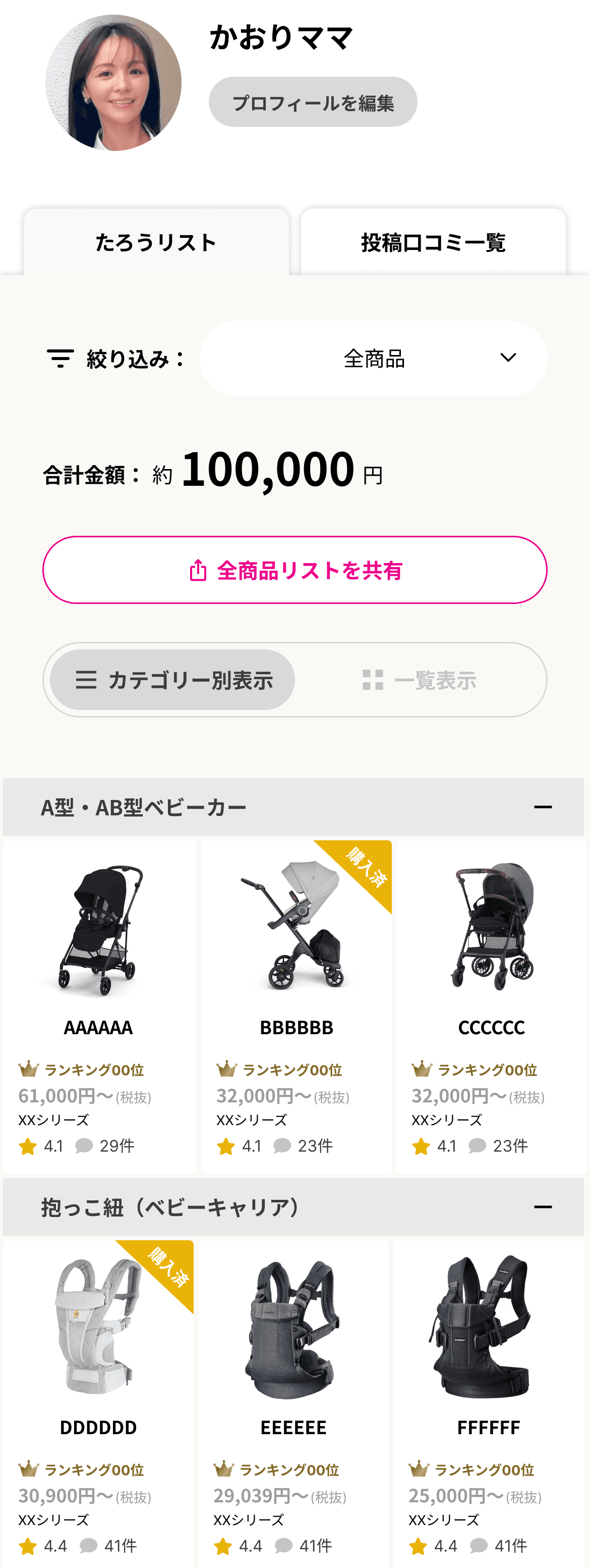 べビューで共有した口コミは「投稿口コミ一覧」機能で、マイページからご家族やご友人に共有することもできるので、おすすめ商品を複数人に一度に伝えたい時にも便利な機能です。